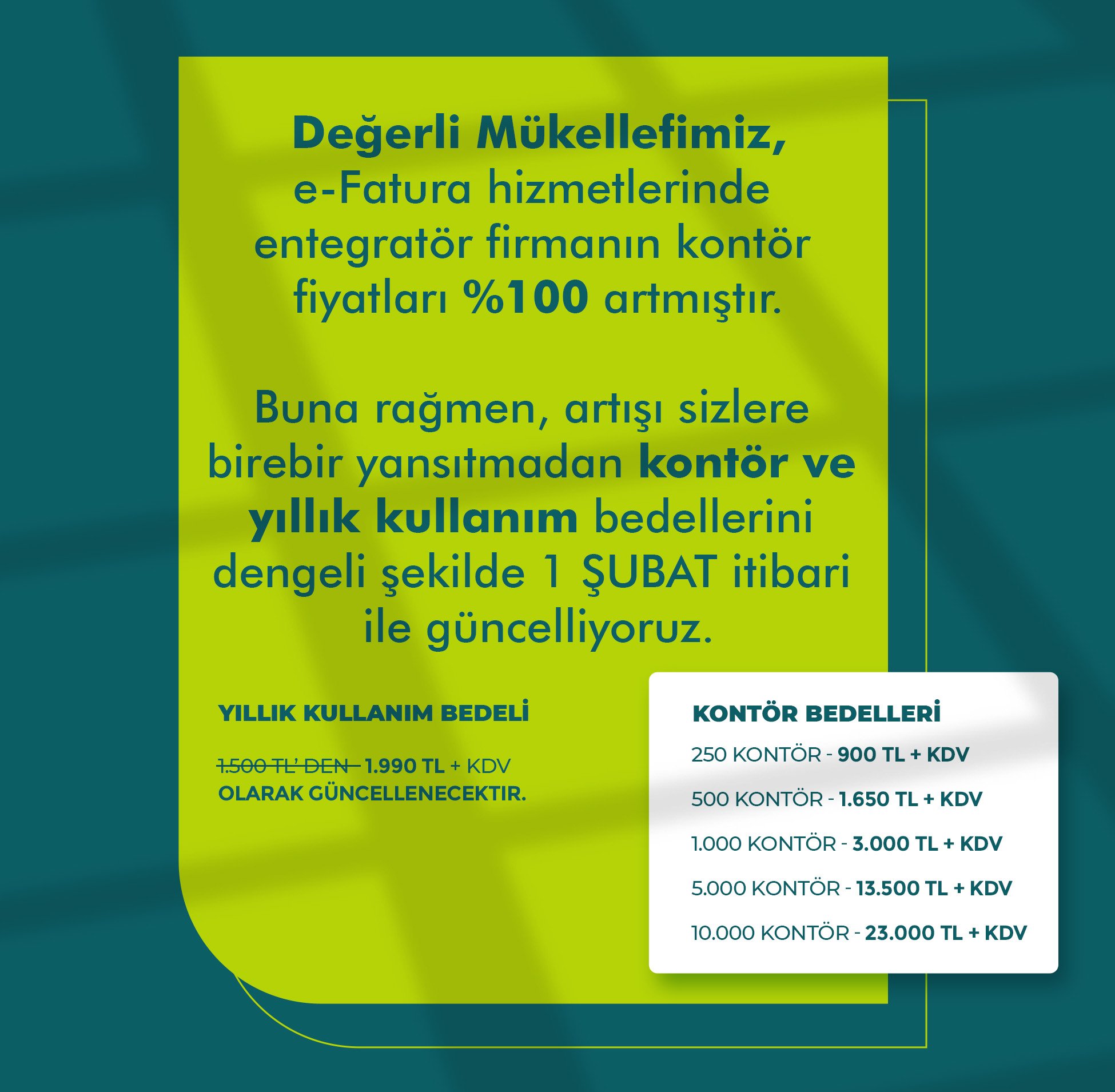 Elektronik ortamda düzenlenen dijital e-Faturalar için bir kontör hizmet maliyeti bulunmaktadır. Bunun için de birim maliyet değeri 1 kontör ücreti ile belirlenmektedir. Kesilen her bir e-Fatura ya da bir e-Arşiv faturanın maliyetlendirmesi 1(bir) kontördür. Bazı faturaların faturalandırmasında çok fazla kalem ürün varsa bu listeye sığmayabilir. Bu gibi durumlarda 2 ya da 3 kontörde olabilmektedir. Bu kontörlerin herhangi bir son kullanma tarihi gibi bir durum yoktur. Kontör dışında e-Fatura kullanımı için bir ücretimiz bulunmamaktadır